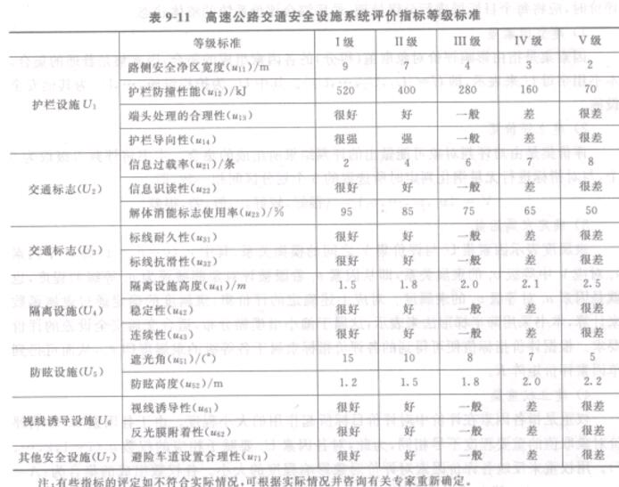 表9-11 高速公路交通安全設施系統(tǒng)評價指標等級標準